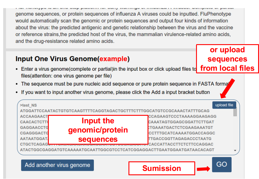 Firstly, input the genomic sequences or proteome of the virus. Attention, one genome or proteome is allowed in each input box. More genome/proteome can be added by click the button “Add another virus genome”.