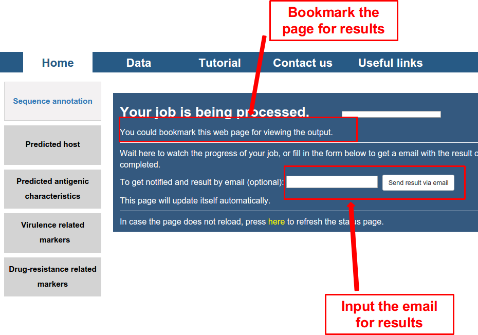 Secondly, submit the task by clicking on the button of “GO”, and a waiting page appeared as follows. User can wait here. It would last for several seconds to several minutes depending on the number of viral genomes inputted. The user can also bookmark the page or input the email (optional), and check the results later.
