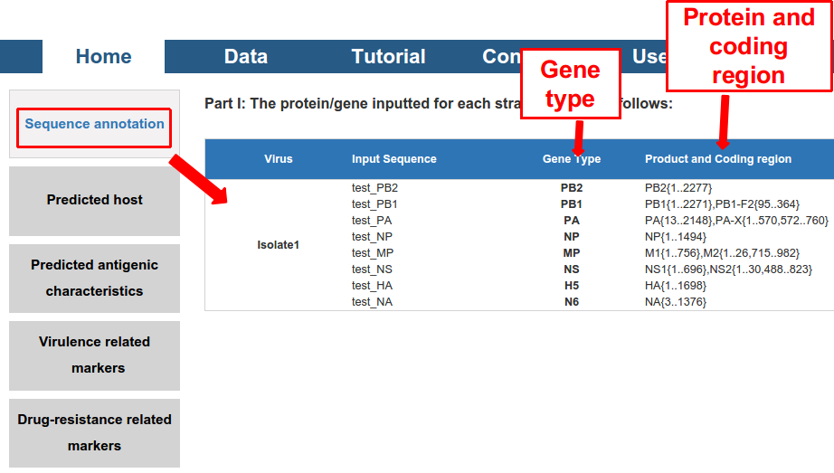1) the “Sequence annotation”, including the gene/protein type and coding region of the sequence (for DNA).