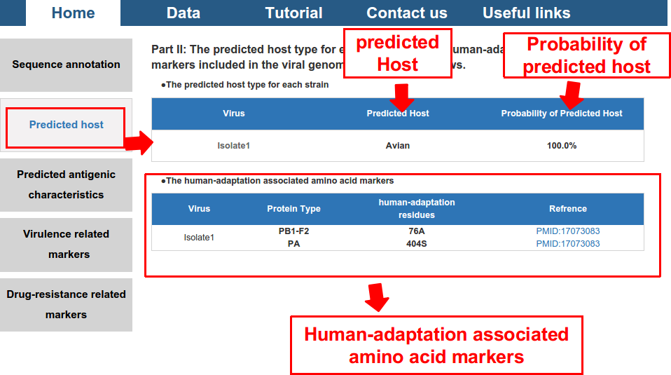 2) predicted potential host and its probability, and also the human-adaptation related amino acid markers included in the proteome of the virus.