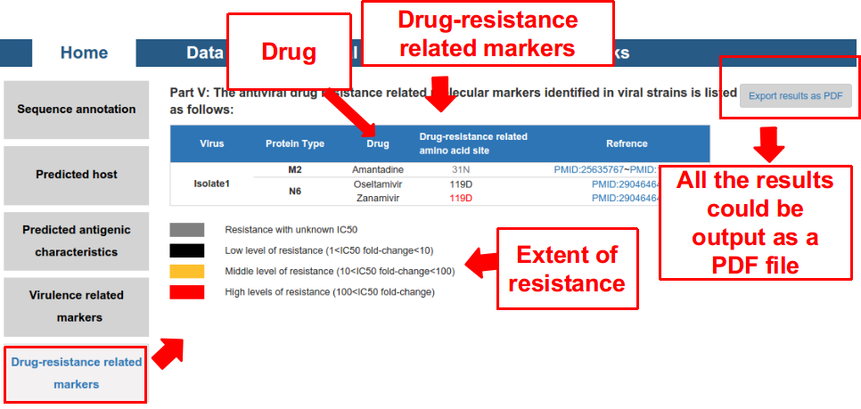 5) drug-resistance (including Amantadine, Oseltamivir, Zanamivir, and baloxavir marboxil) related amino acid markers included in the proteome of the virus.